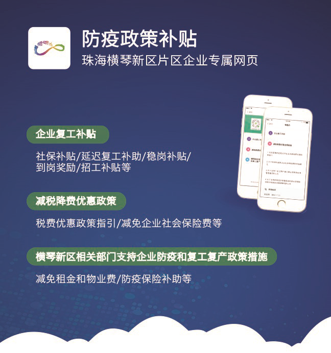 横琴企业专属网页根据企业和人员特点并结合出台的各类政策,分类分级推进企业复工复产。一是“复工备案监测系统”分级监测,有效提高复工复产备案效率。横琴企业专属网页2月上旬开发上线的“复工备案监测系统”,实行政府、园区、企业三级备案监测制度。企业在该系统向园区主管部门提报,由主管部门具体工作人员进行材料初步审核备案,由部门负责人进行再次把关,最后由区分管领进行最终审批备案,层层备案,确保了企业的疫情防控措施能够切实有效。网上提交、不见面备案,可减少疫情扩散风险,提高备案工作效率。二是分类定制防疫政策二维码,助力企业全面、高效了解疫情优惠政策。横琴企业专属网页依据最近发布的优惠政策,制作了防疫政策补贴二维码,一码囊括企业复工补贴、减税降费优惠政策及区相关部门支持防疫的复工复产措施等三方面优惠政策。办事人员扫码即能清晰、准确了解涉及行政审批、财税金融、就业社保、房租减免等诸多方面的政策内容及对应的办事流程、负责部门、联系方式、办事地址等信息,实现一“码”在手,疫情政策全有。此外,横琴企业专属网页后续将不断更新二维码承载内容,为企业提供更全面、精准的防疫政策补贴等资讯。
